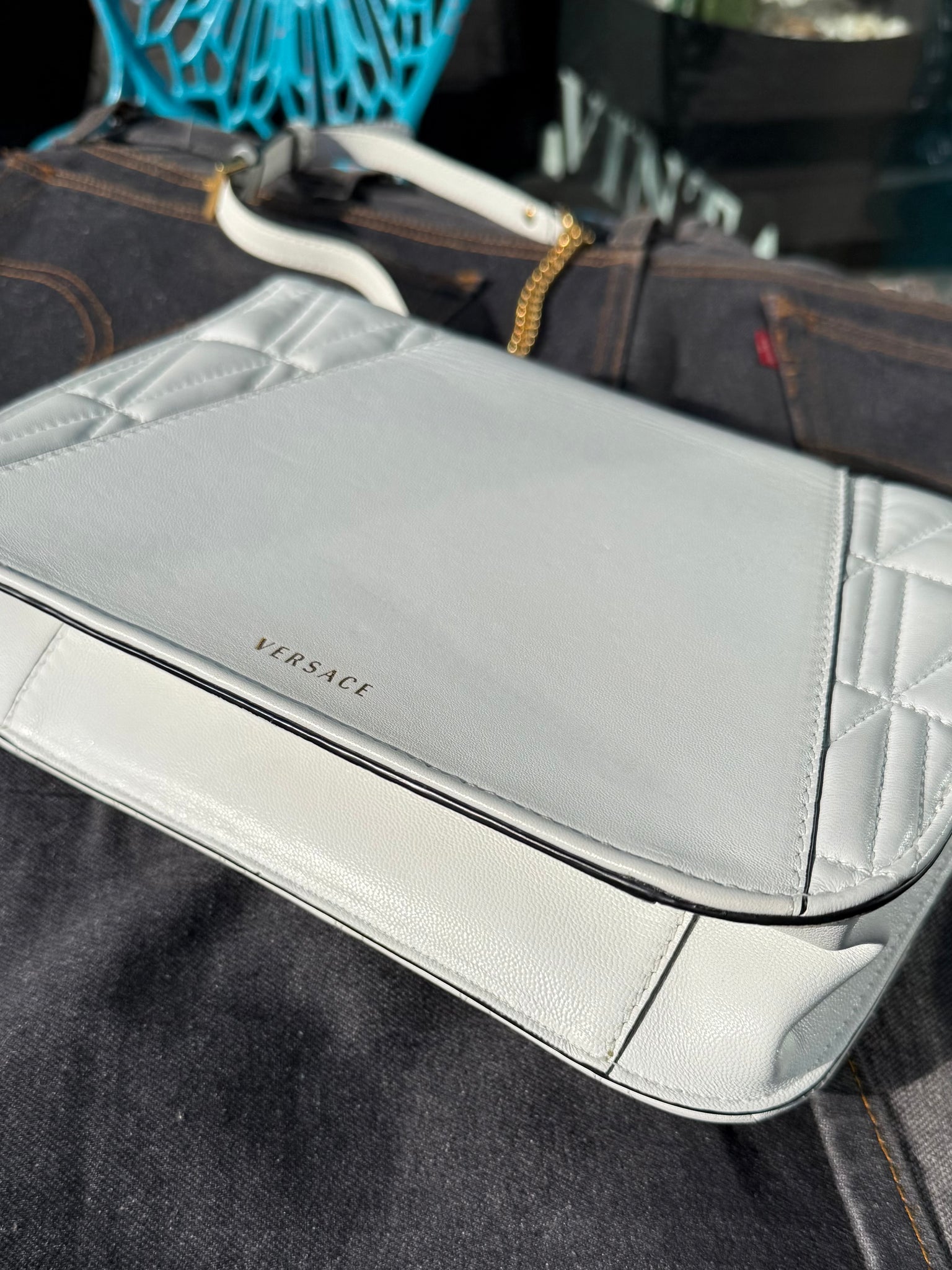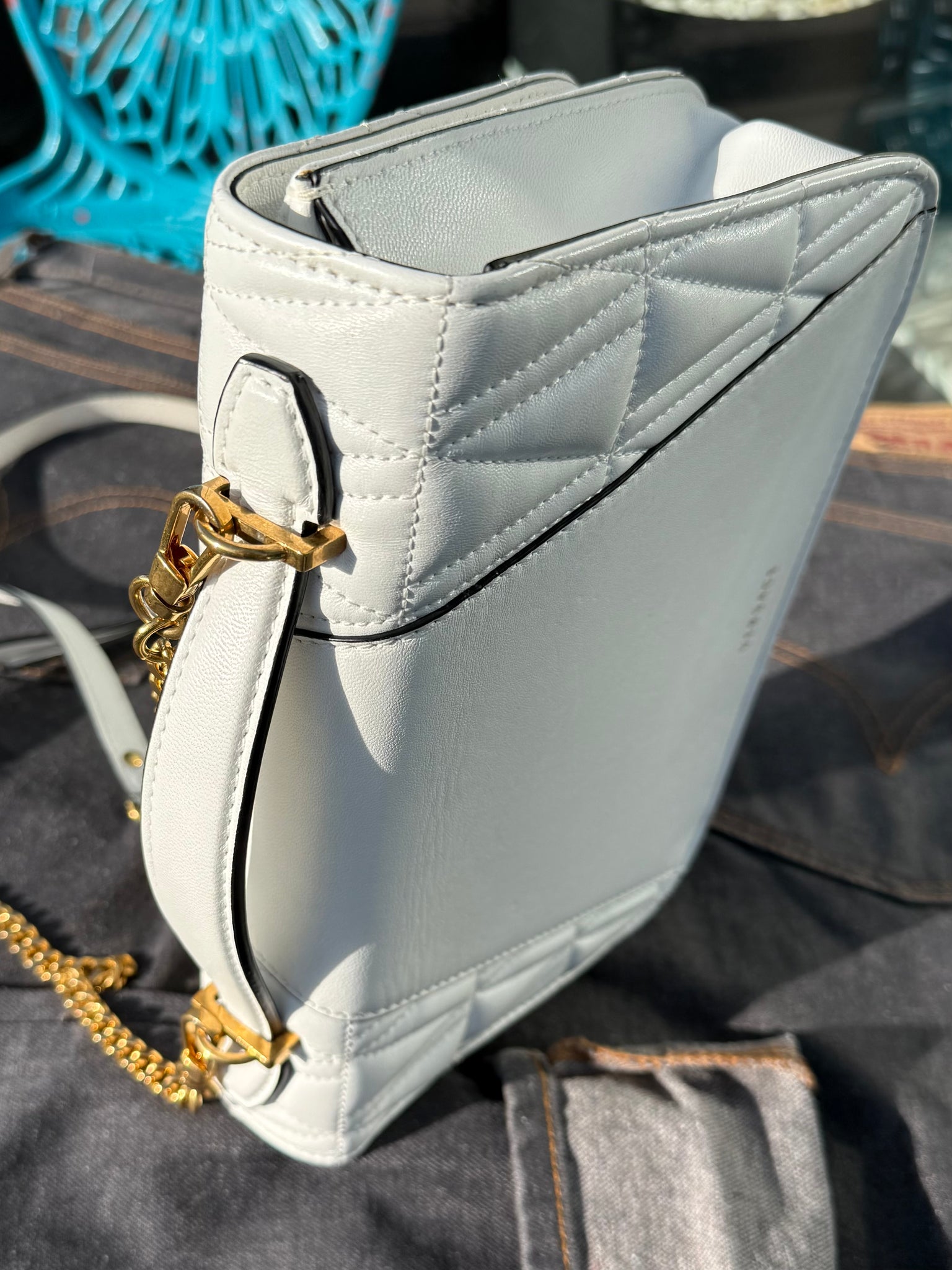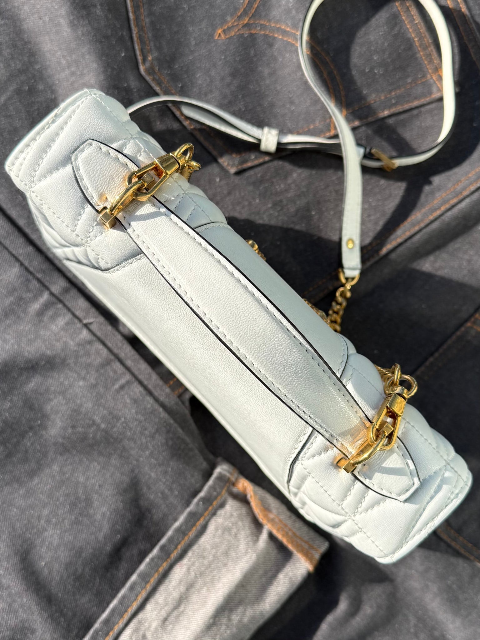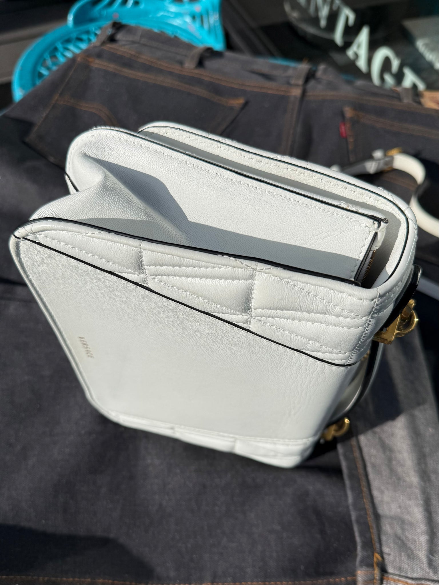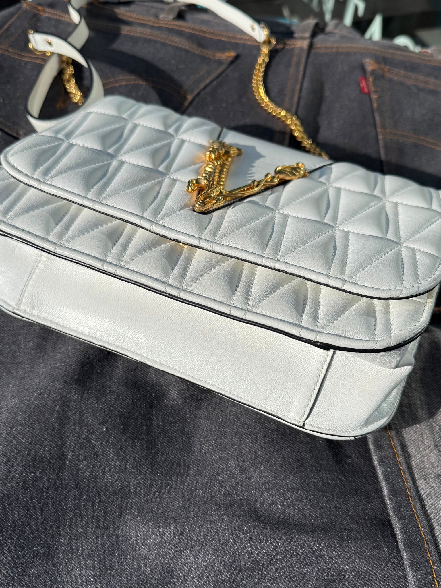 White leather handbag with front gold-tone metal logo