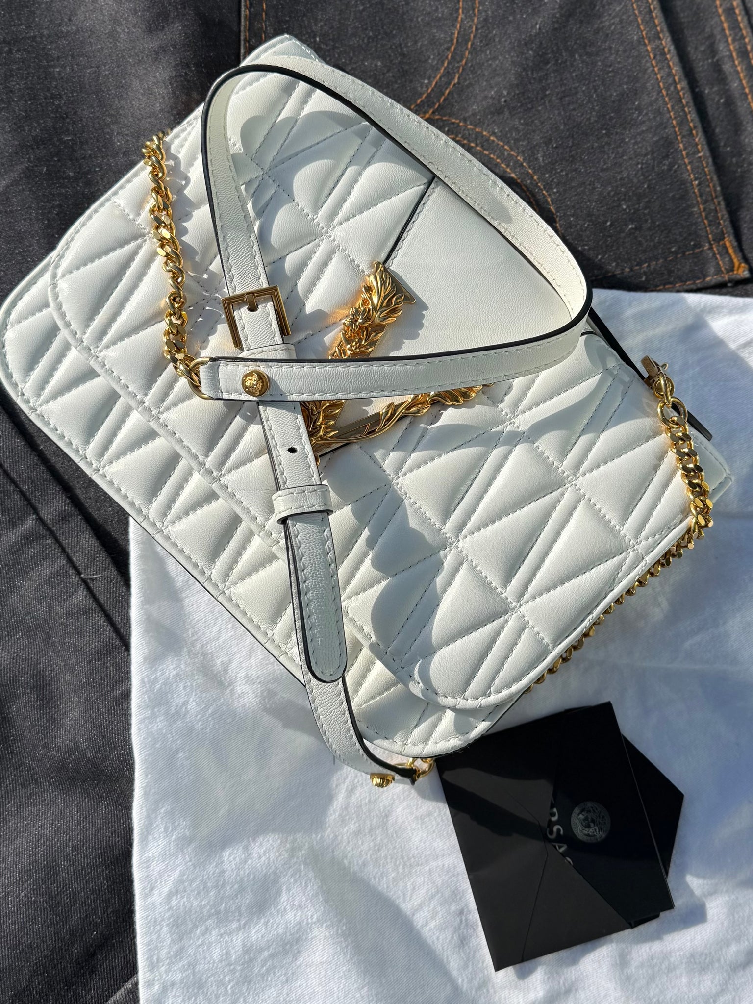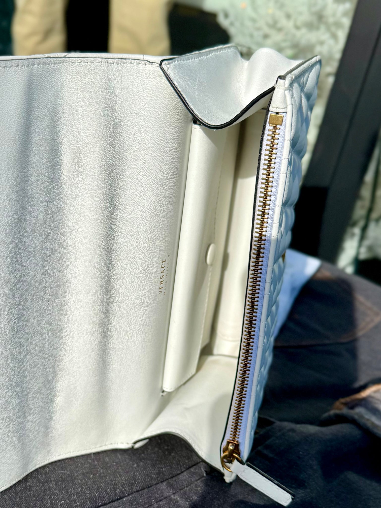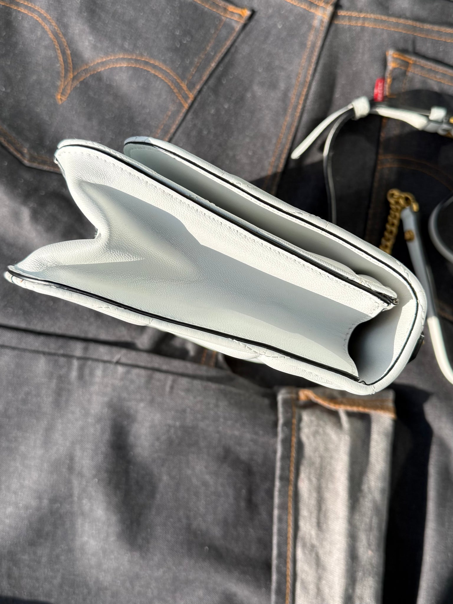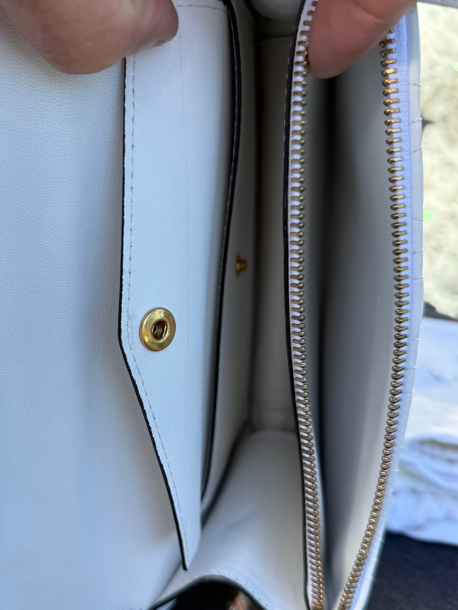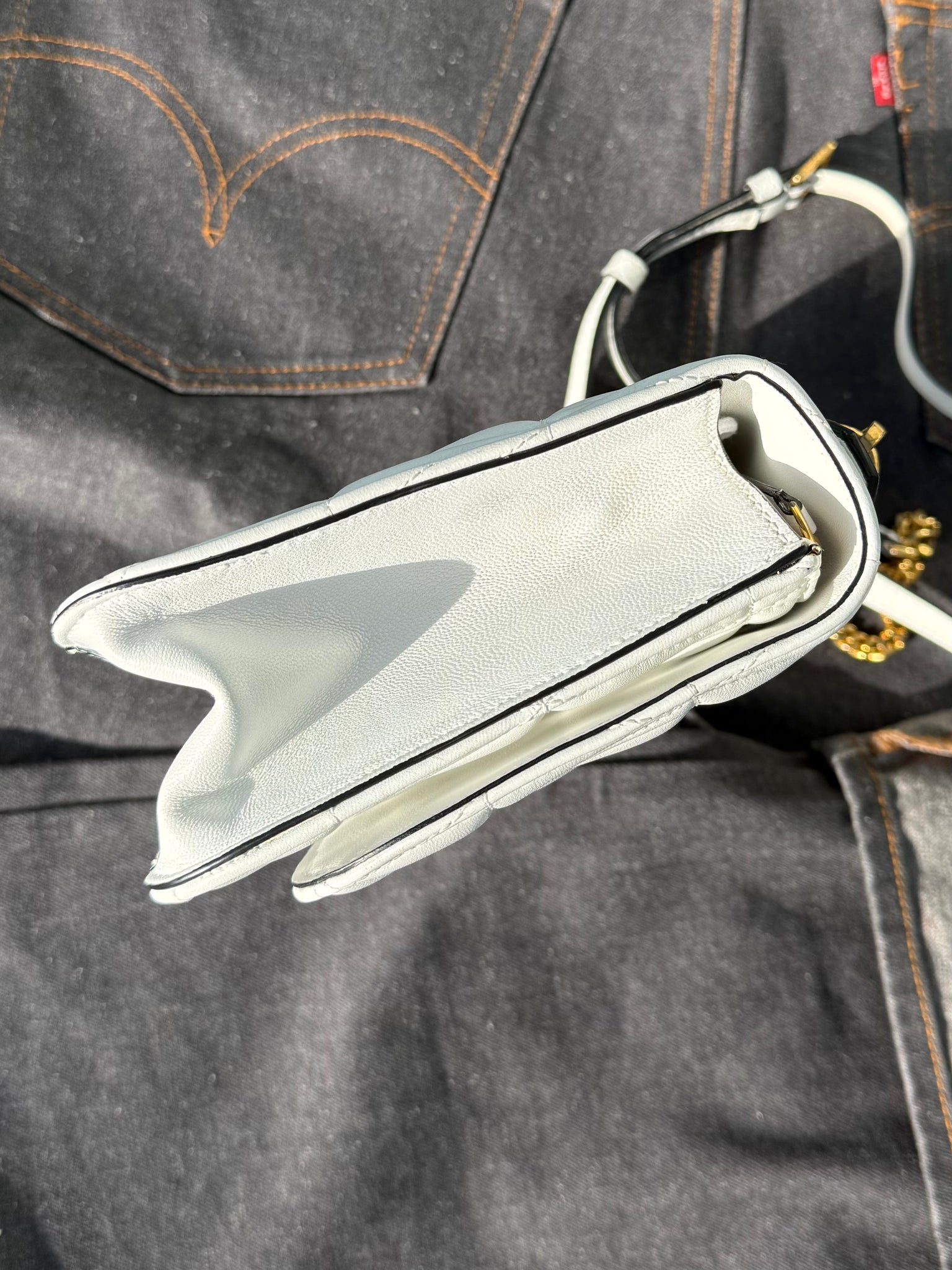 White leather handbag with front gold-tone metal logo