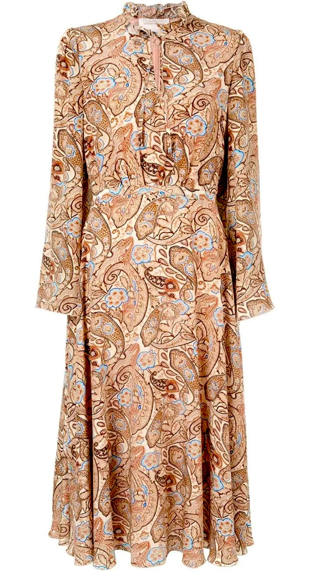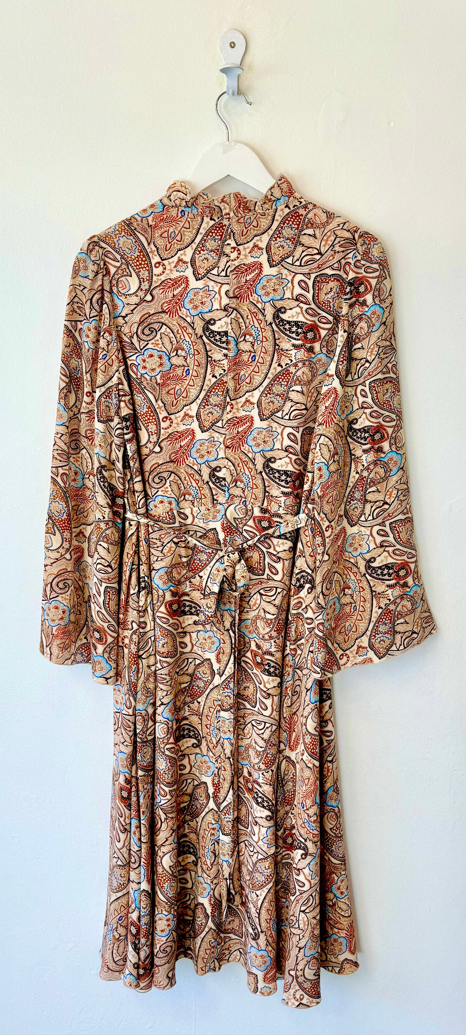 This timeless dress in a neutral paisley print by Karen Walker is crafted from 100% Silk and features a round neck with a tie fastening and frill detailing as well as long fluted sleeves and a tie waist belt and completed with a side zip closure.