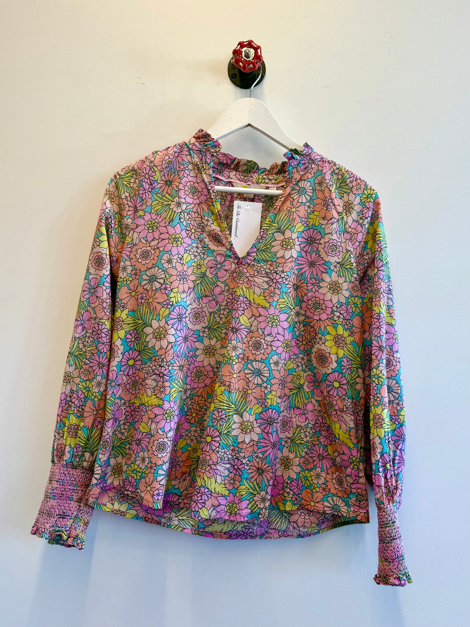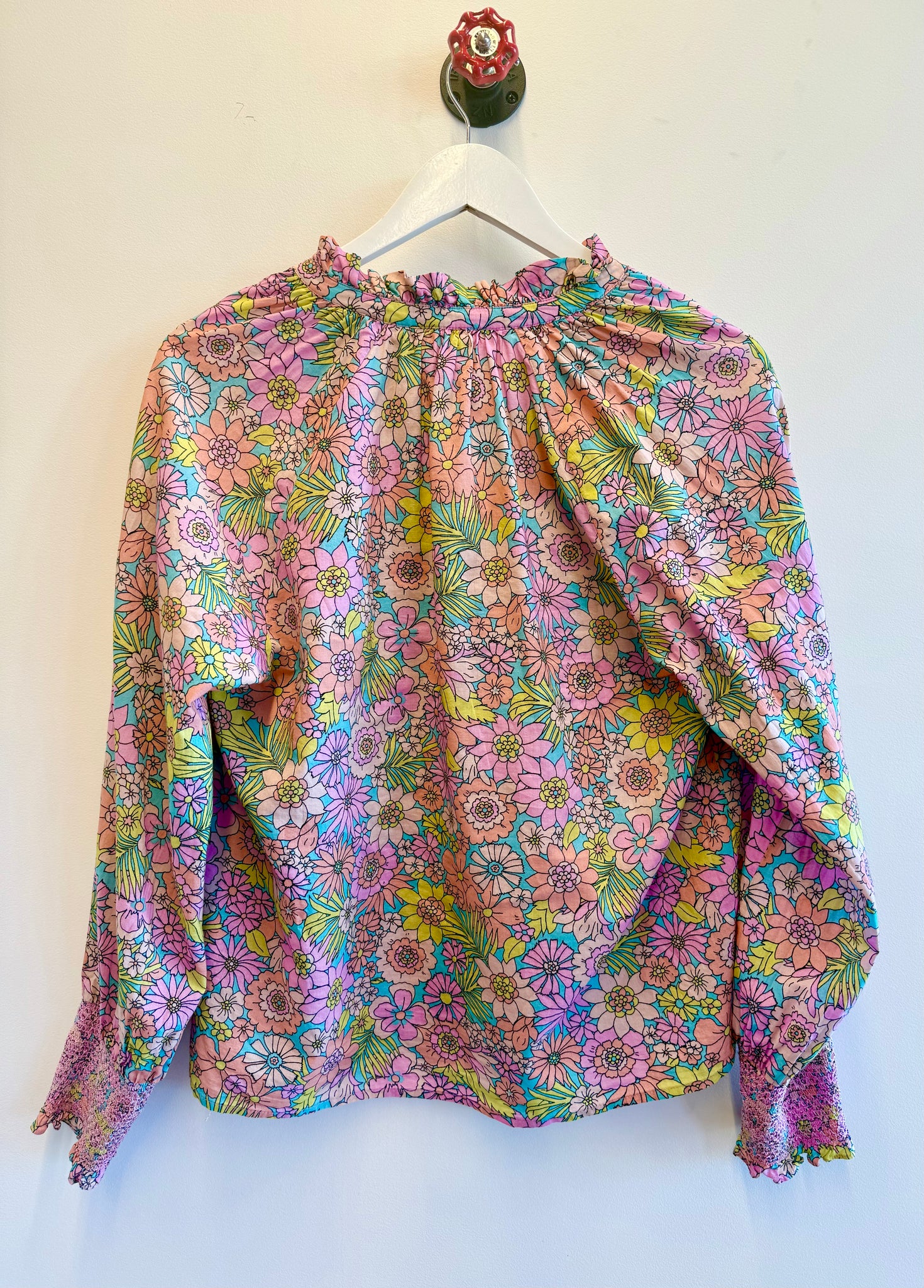 A beautiful lightweight cotton blouse with a ruffled collar and long sleeves with smocking cuff detail in a summery floral print.