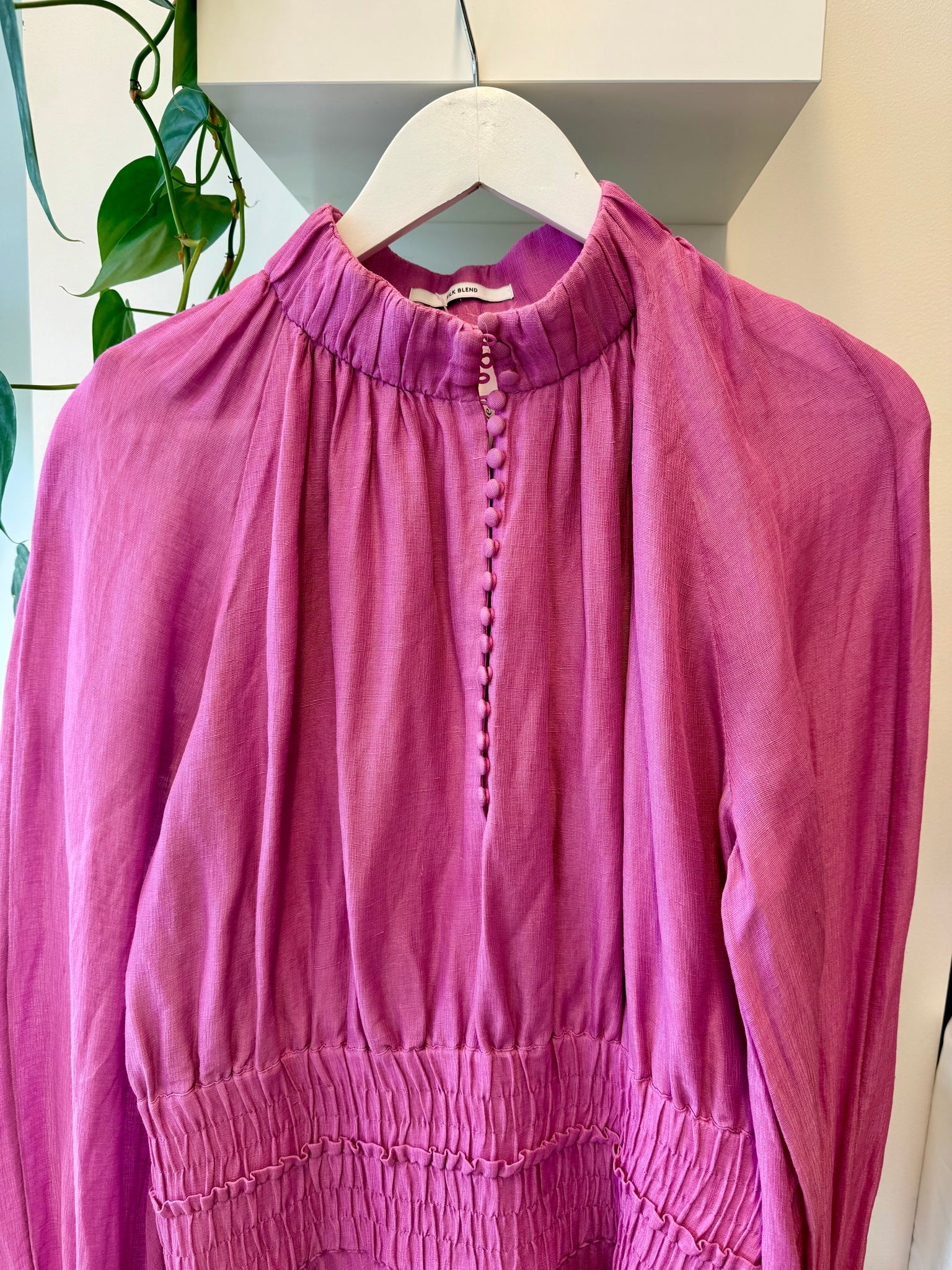 This linen silk blend midi dress from the iconic Country Road is crafted from a beautiful Silk/linen blend with blouse sleeves that lead to a deep cuff and shirred detailing at the waist. There is also the gathered mock neck and beautiful fabric covered buttons through the centre of the bodice.