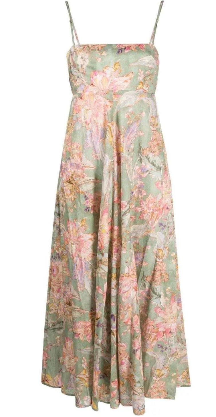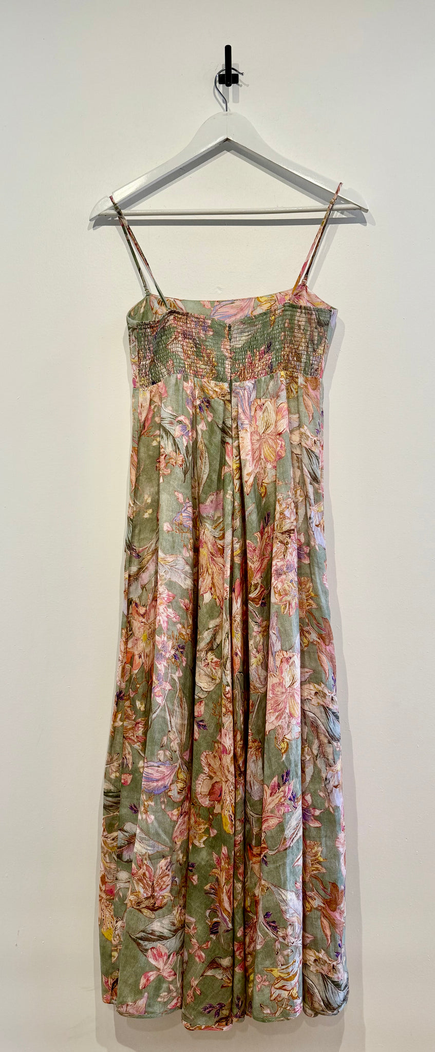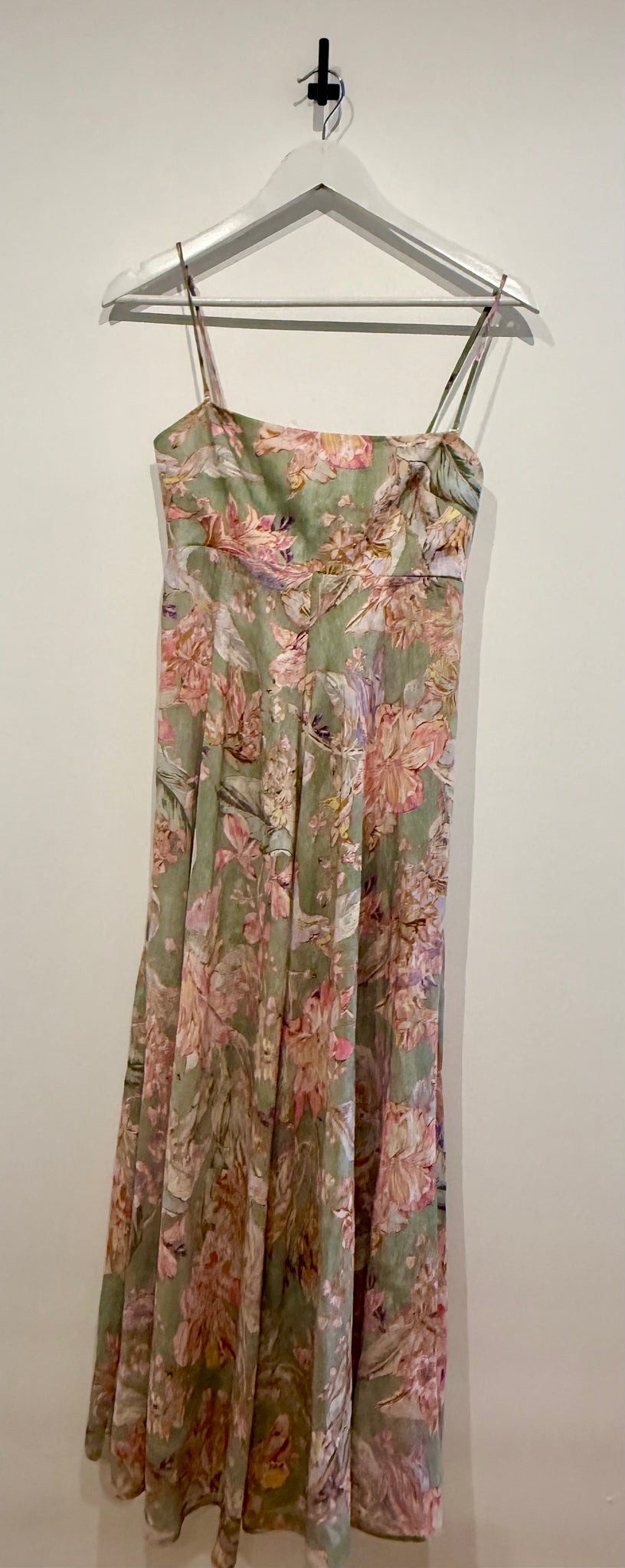 A stunning but simple bandeau dress from Zimmermann. With a flattering square neckline and removable thin shoulders straps that keeps the dress simple and functional. There is a concealed rear zip fastening and the back of the bodice is ruched that leads into a full midi skirt. All showcased in a beautiful light green floral print linen fabric.