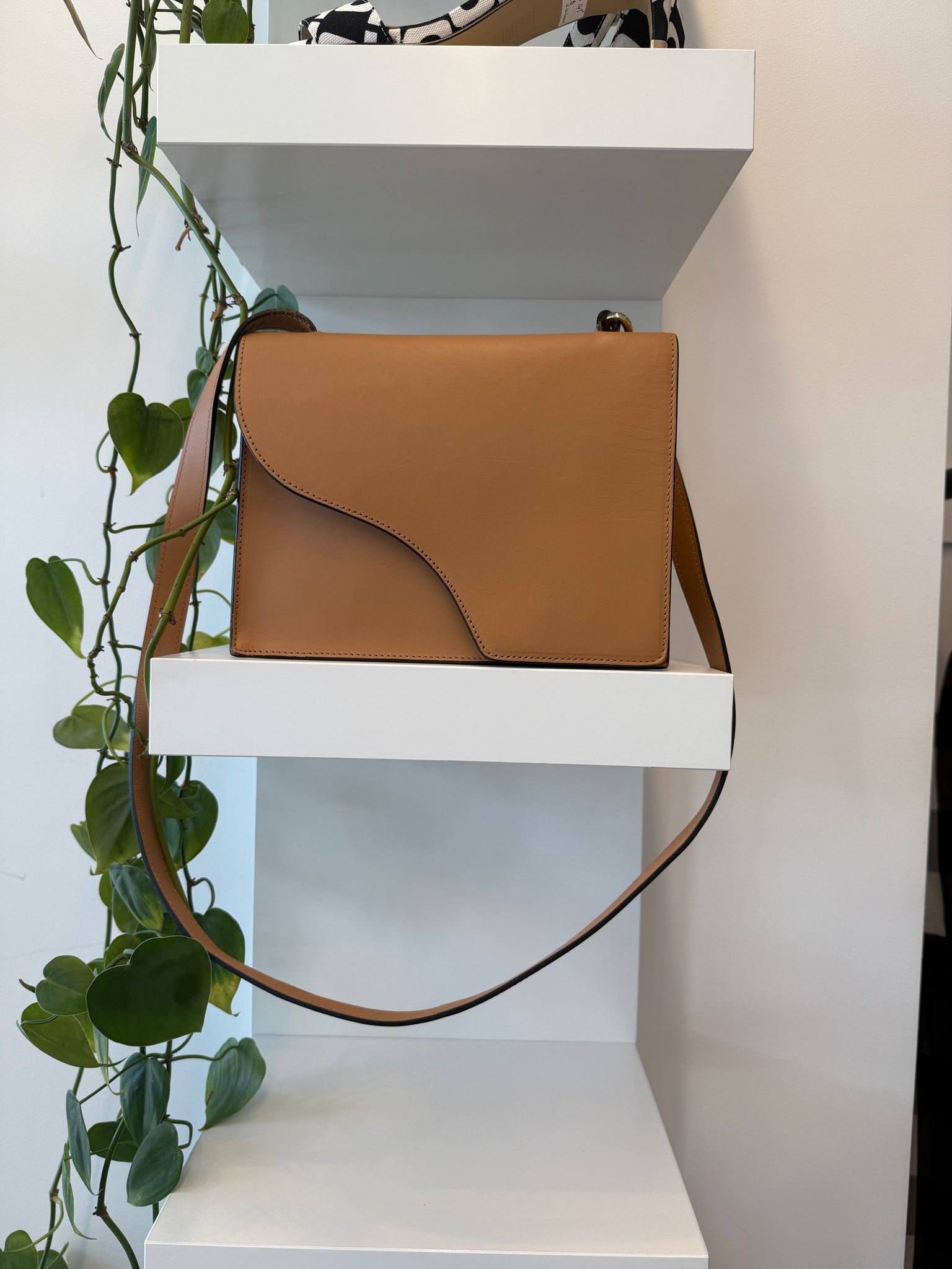 A classic crossbody bag with a modern twist! Crafted from smooth calf leather featuring 2 compartments secured by a magnetic flap and a removable shoulder strap. Embossed with the logo and completed in gold brass hardware.